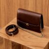 Acompanha duas alças removíveis – uma longa em couro e uma corrente metálica – permitindo três modos de uso: no ombro, atravessada ou sem alças, como bolsa de mão.