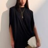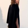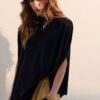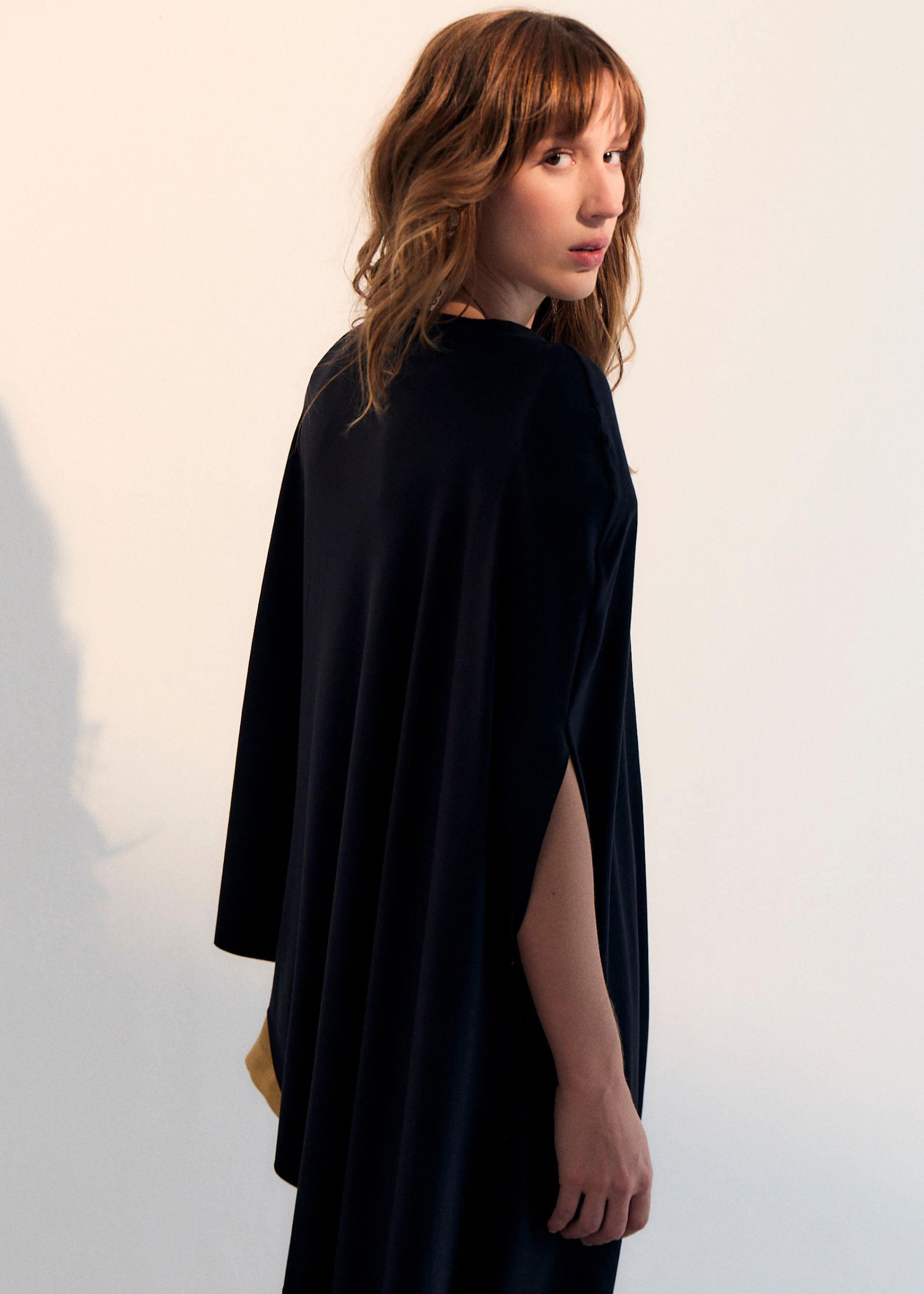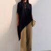 com assimetria sutil e gola careca finalizada em ribana larga. A linha limpa e
