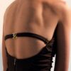 O elástico das costas sustenta e a fivela com monograma adorna. É corpo e ornamento ao mesmo tempo.