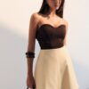 com firmeza e delicadeza. O busto estruturado traz sensualidade segura, enquanto o drapeado lateral
