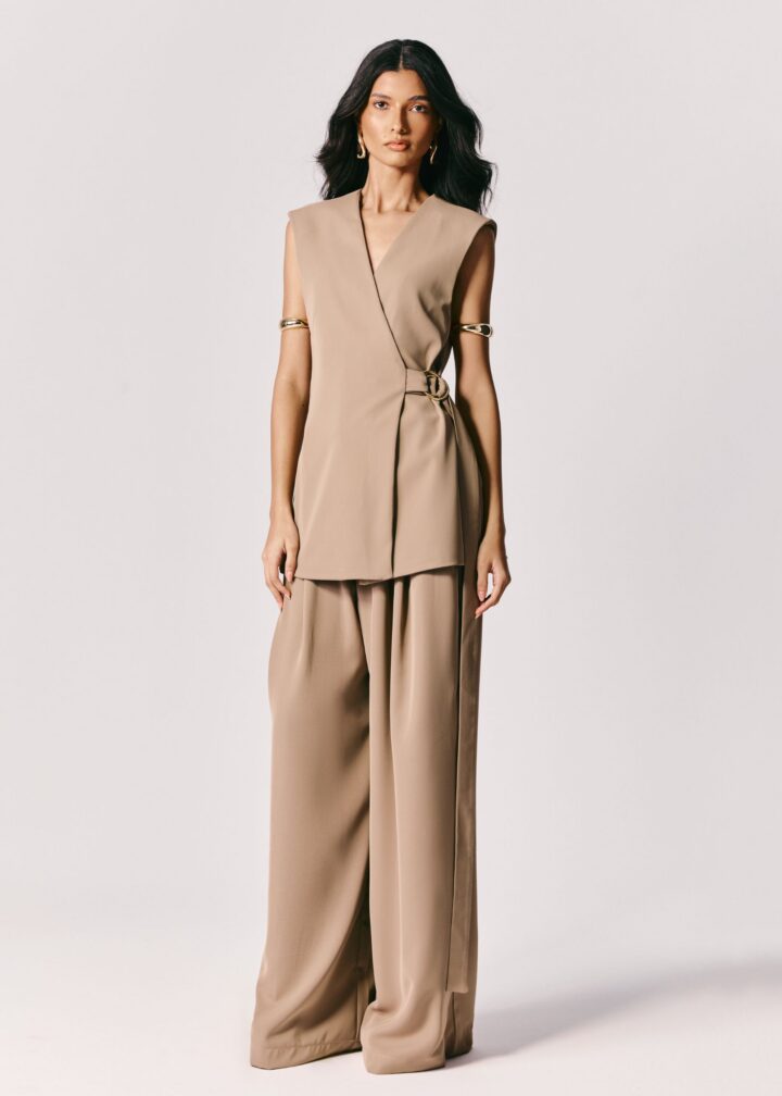 A Calça Dalia tem pregas profundas frontais que dão fluidez à construção clássica, enquanto