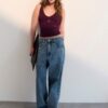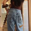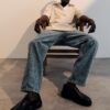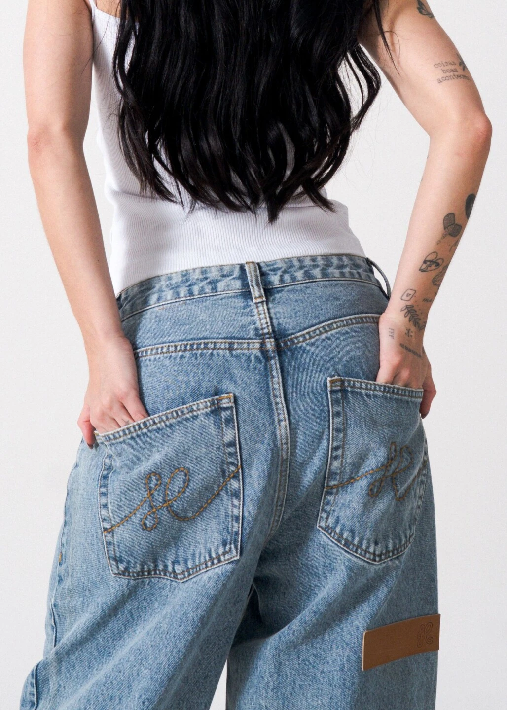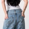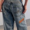 Com fit relaxado, gancho levemente mais baixo e pernas amplas, a peça carrega um caimento fluido, revelando um novo olhar sobre o streetwear contemporâneo. O acabamento destroyed com desbotes, desgastes esbranquiçados e bigodes marcados reforça o espírito jovem e o contraste entre o uso e o desejo.