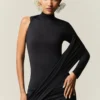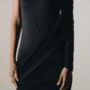 Construção limpa e contínua, com foco em alongar e refinar a silhueta. O babado desconstruído e assimétrico aplicado na barra frontal carrega o código de design da marca, conferindo movimento e identidade. As alças removíveis permitem variações de uso, reforçando a versatilidade. Uma peça que sustenta protagonismo com discrição e elegância atemporal