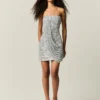 necessidade de alças, enquanto o drapeado lateral em moulage valoriza as curvas com naturalidade. O forro em poliamida envolve o corpo com suavidade, garantindo conforto e movimento mesmo sob o brilho intenso. Uma peça que transforma o instante em cena puro desejo, pura arte.